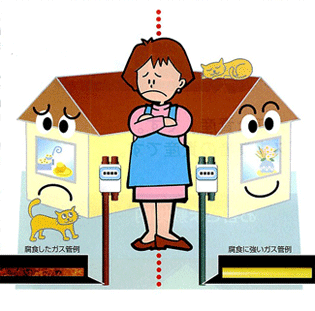 暮らしのエネルギー「都市ガス」を運ぶガス管。それは毎日休みなく、私たちの体にエネルギーを運ぶ血管によく似ています。ひとたび異常が発生すれば、快適な暮らしを送ることは出来ません。古くなったガス管は、早めのお取り替えをおすすめいたします。 |