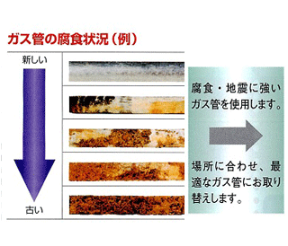 | 土の中に埋められたガス管(亜鉛メッキ鋼管)は、一般的に年を経るとともに腐食が進行しており、その埋設環境により差がありますが、「およそ20年が取り替えの目安」といわれています。 | ![]() |